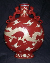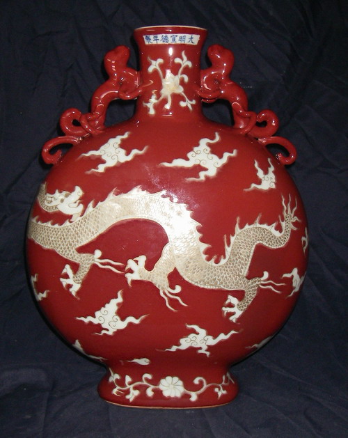 明 宣德:紅釉描金留白龍紋扁壺